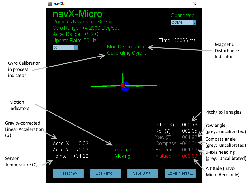 The navXUI user interface application provides a simple way to visualize the data provided by navX-Micro.