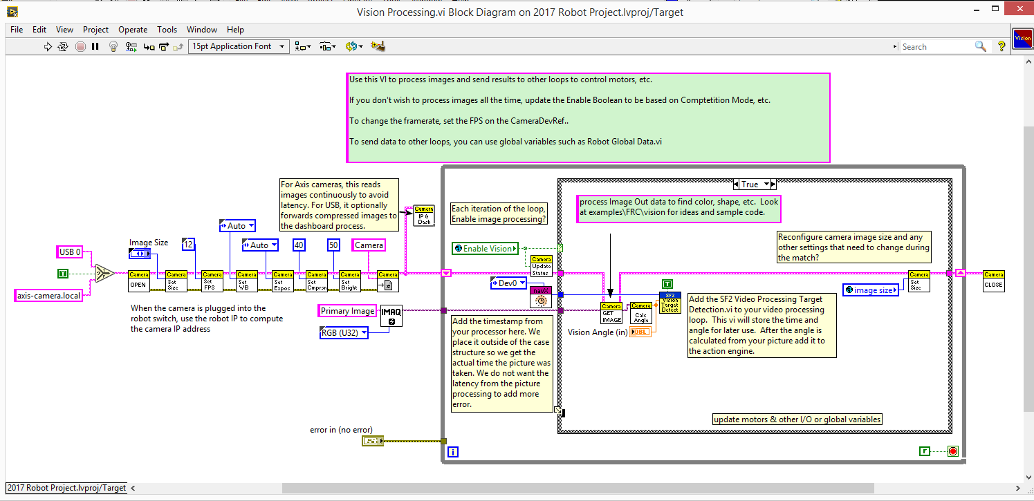 The SF2 Video Processing Latency Correction LabVIEW example shows how to make small modifications to the LabVIEW “FRC RoboRIO Robot Project” to correct target detection angles to account for Video Processing Latency using a navX-Model device and the SF2 Orientation History Buffer.