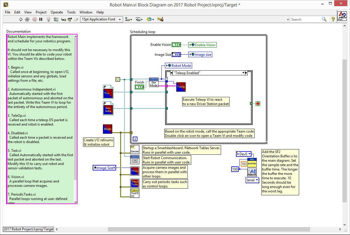 The RobotMain.vi is modified to add initialization of the navX-MXP communication (in this case, over the MXP SPI Bus), and to also construct the Buffer with the appropriate size.
