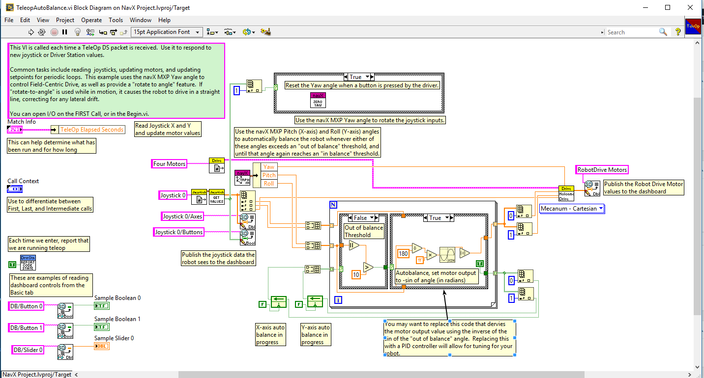 The navX-MXP AutoBalance LabView example shows how to make small modifications to the LabView “FRC RoboRIO Robot Project” using the “Mecanum Robot” configuration to implement high-accuracy Automatic Balancing.