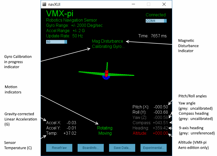 The navXUI user interface application provides a simple way to visualize the data provided by VMX-pi.
